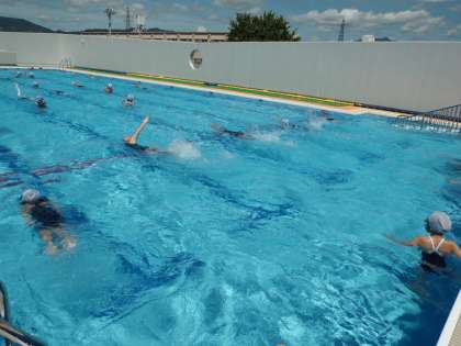 かなり厳しいひざ下照りつける中,子どもたちは1時間目から水温31度のプールに歓声をあげて入っています。