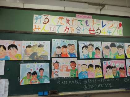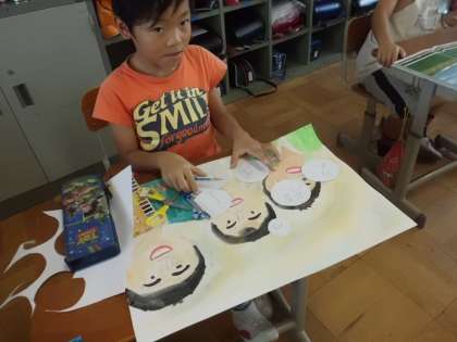 自分と友たちのにこにこ顔を描いたり,手をつないでいるところを描いたりして