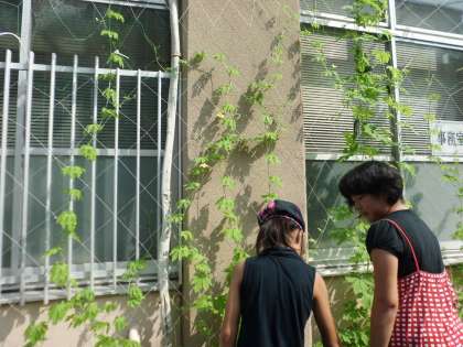 夏やすみに入って,一気に大きくなってきました。みどりのカーテンのゴーヤは15センチぐらいの実をつけています。ヒョウタンやヘチマもツルをぐんぐん伸ばしています。