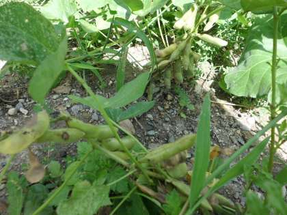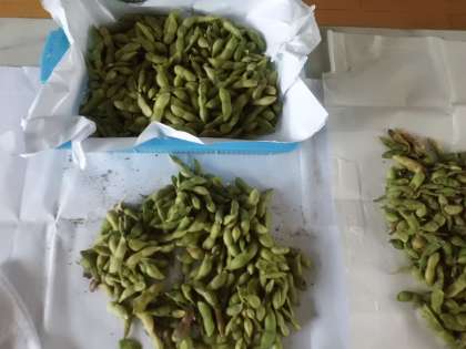 4年生が一人一鉢で育てていたエダマメ。おいしそうな実がたくさんつきました。一本のくきにエダマメが25個から30個もついていて,びっくりしました。1個の種からマメが50個以上になったことに驚きました。