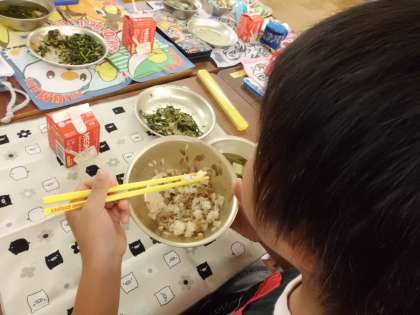 自分で,とりめしの具をごはんに混ぜて食べます。
