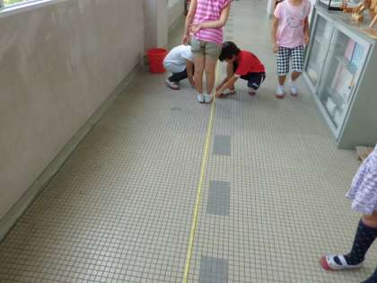 一人ひとりが,10秒歩いて,歩いた道のりを巻尺で測りました。ストップウォッチで10秒を計ったり,長さを測ったり,みんなで協力し合いました。10秒を見逃さないように,一生懸命にストップウォッチを見ました。何m何Cmになるのかもみんなで読み合いました。