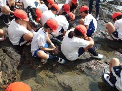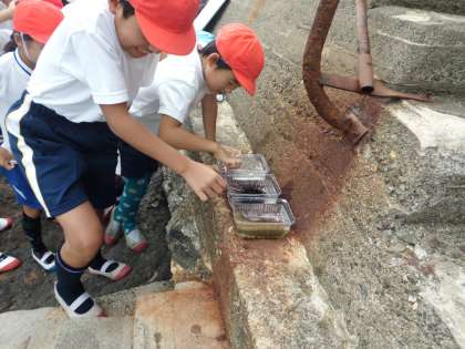 マリンランドの方が,みんなにヒトデを持ってきてくれました。一人ずつヒトデを観察したり,触ったりしてヒトデの生態を知りました。ウニやナマコも触らせてもらいました。海の生き物に興味をもった子どもがたくさんいました。台風のうねりで波がきつく,磯には降りられず,磯観察は残念でしたが・・・。面白い話をしてくださって,海の生き物のことをしることができました。マリンランドの方,ありがとうございました。
