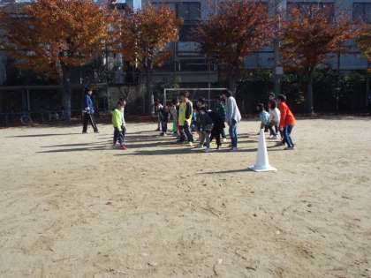 まず,クラスごとに準備体操をして,5分間,自分のペースで走っています。「今日は,9周走った!」「○○さんを追いかけて走った」「昨日よりたくさん走った」・・・みんな一生懸命走っています。7日のマラソン大会がとても,楽しみな4年生です。
