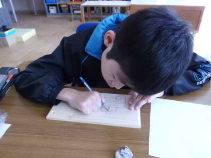 今日、図工の時間に卒業制作として、木製のフォトスタンドを作っていきました。今日は、1時間目なので木に下書きをしていきました。