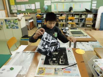 版画インクで、版画を刷り上げています。手が汚れて大変だけど、頑張って刷っています。