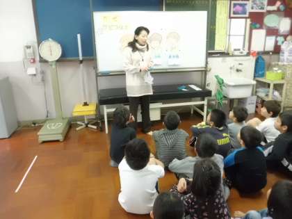 保健室で身体計測。計測する前に,風邪の予防について学びました。咳の速さは,台風の風の速さぐらい。くしゃみの速さは新幹線の走る速さぐらい。「うわあ。すごく速い。」咳が跳ぶ距離は3.5mぐらい。くしゃみが跳ぶ距離は5mぐらい。「遠くまで飛ぶんやなあ。」咳やくしゃみが出るときは,しっかり手を口にあてる。または腕で防ぐ。マスクをする。大切なことを学習しました。