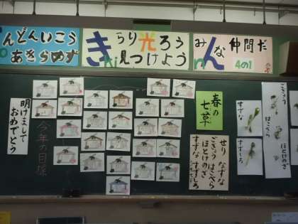 朝会での校長先生のお話の後,教室で今年の目標を書きました。今年は5年生に。今年のみんなの抱負が揃いました。また,『春の七草』を覚えました。昔から伝わる行事や慣習を大事にしてほしいと思っています。