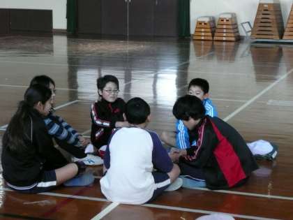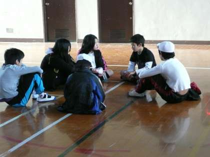 試しのゲームを終えての班ごとに作戦タイムをとっている
