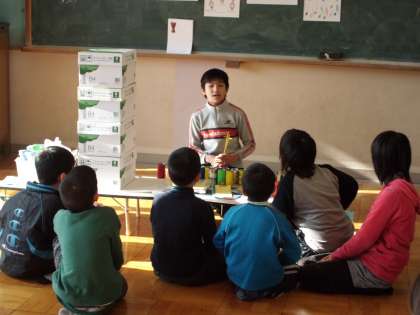 小さな巨匠展に向けて、三校共同制作に取り組みました。看板を作ったり、飾り付けを作ったりしました。みんなとても頑張っていました。写真は、ぼくがみんなに作業の手順を説明しているところです。