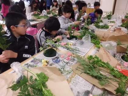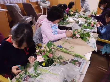 苔を敷いて,ツタのアーチができたらいよいよ花をオアシスに生けていきます。がーべラ,カーネーション,スイトピー,キク,菜の花,シダ,カスミソウを切って,いろどりや配置を考えながらいけていきました。思い思いにアレンジを楽しみ,かわいいすてきなフラワーアレンジメントになりました。みんな,とても楽しそうでした。花に触れ,心も少しほっこりできたひと時でした。ちょっと難しかったけど楽しかったと,できた花を大切に持って帰りました。