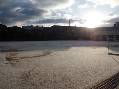 28日の朝は,寒波の影響で運動場にうっすら雪が積もっていました。