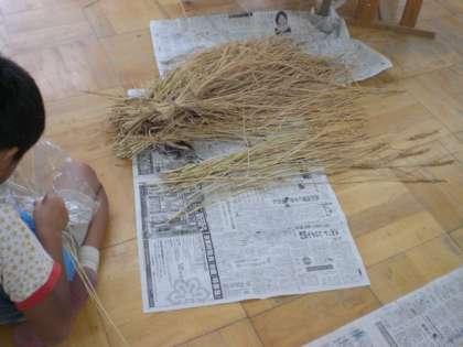 刈り取って干しておいた稲を,ビニール袋と割りばしを使って脱穀しました。割りばしで稲をはさんで引き抜くと,穂だけがビニール袋に落ちる,という方法でやってみました。最初はうまく取れなかったのですが,何度かやっているうちに,ビニール袋に少しずつたまってきて,「できた!」とこどもたちは喜んでいました。たくさんあるので,少しずつ脱穀していきたいと思っています。