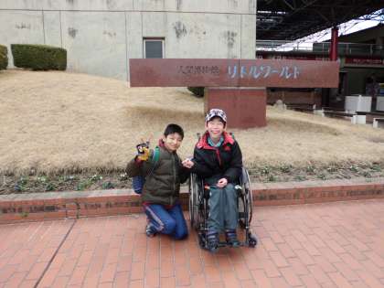 リトルワールドに着きました。入場門の前で、記念撮影しました。