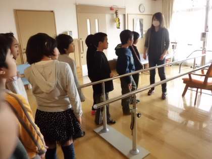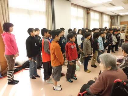 施設のおじいさん,おばあさんの前で,♪「こきょうの春」をリコーダーで演奏しました。その後♪「野に咲く花のように」の歌を聴いてもらいました。「上手やねえ。」「かわいいねえ。」と声をかけてもらいました。お年寄りの方に喜んでもらえてとてもうれしかった4年生です。それから 施設の中を見学させてもらいました。学ぶことがたくさんあった経験になりました。