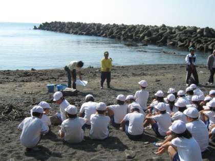 マリンランドの学芸員の方に、海の生き物について教えていただいています。自分がみつけた生き物の名前を教えていただきました。生き物を海に返すときは、気をつけて返しました。