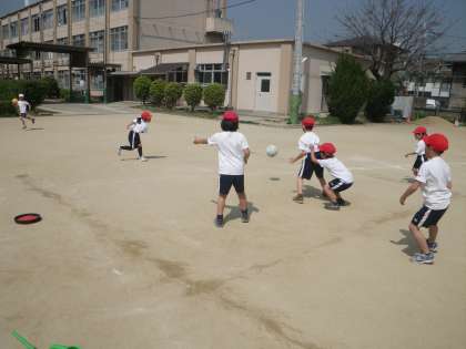 子どもたちは遊具でニコニコ,タイヤ飛びドンじゃんけんではぁはぁ,ドッジボールで白熱と,元気な体育の授業を過ごしました。