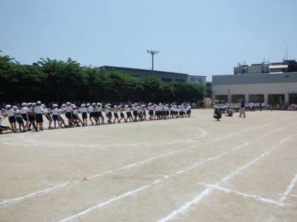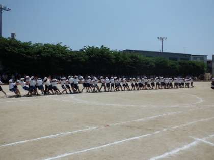 全校みんなでつなひきをしました。1年生も上級生と一緒に綱を力いっぱいひっぱりました。「そーれ!そーれ!!」「ひっぱれ!ひっぱれ!!」声を出しながら引きました。