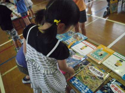 体育館の長椅子の上にはびっしりと選定用の本が並んでいます。
