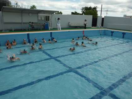 プールでのきまりや水遊びの約束をしりました。今日は水なれ。「カエルのうた」を歌いながら腰洗いやシャワーをしたり,顔を洗ったり,ワニ歩きでプールを回ったりしました。みんな,水をこわがらずに水遊びを楽しんでいました。