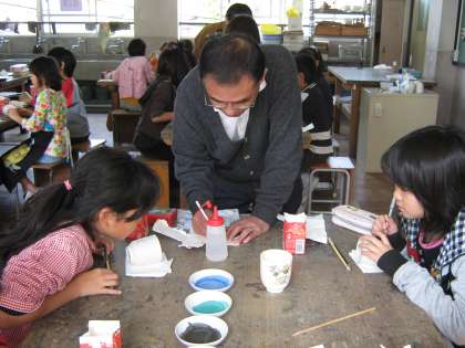 清水焼の伝統工芸士の方々に、絵付けを教えていただきました。