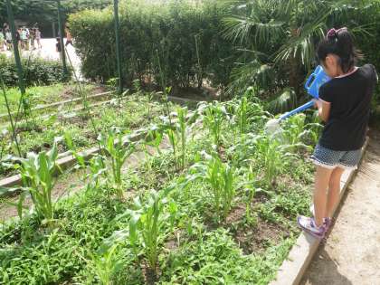 ジョウロを片手に,花壇や畑・プランターの作物に水をやっている子もいます。