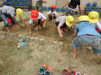 先週,図画工作の学習で「すなやつちにさわっていろいろなかつどうをたのしもう」という活動をしました。造形砂場で土や砂を使って試したいことをそれぞれが試しました。穴を掘ったり,水を流して池のようにしたりしている子ども達もいました。