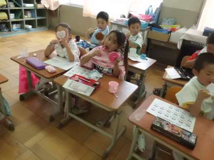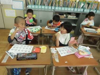 自分の歯のどこが汚れていたのかが分かったので,次は歯のみがき方を学習しました。赤く染まったところをしっかりとみがいて汚れを落としました。みんな,真剣にみがいていました。自分に合った歯のみがき方を知った1年生です。