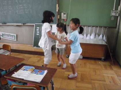 音楽では,ロックのリズムに乗って動物の鳴き声を表現したり,お祭りの曲に乗って掛け声を合わせたりしています。