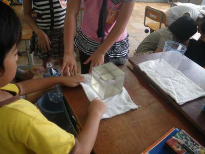 円柱形の1リットルますに入れ替えたり,2リットルのペットボトルに移し替えたりなど,具体的な操作をしてみました。