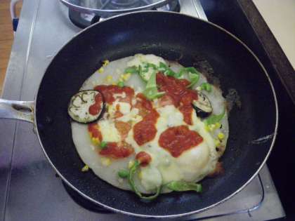 トマトやピーマン,ナスやチーズの乗った,なんとも美味しそうなピザ。