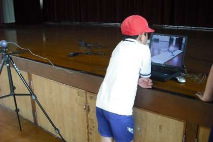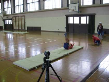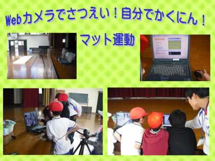 「マット運動」の学習をしました。3年のマット運動では,Webカメラを使って自分の技を撮影し,それを自分で見て確認できるようにしました。撮影した映像が15秒ぐらい遅れてコンピュータに映るようにしてあるので,マットで技をした後コンピュータの前で待っていたら,自分の姿がコンピュータに映ります。自分の目で技の出来を確認できるので,子ども達は興味津々でのぞきこんでいました。