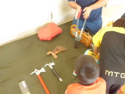 西京極消防分団の方から,仕事の内容や消防器具についての説明など,たくさんのことを伺いました。実際に道具や器具にも触れさせていただきました。子どもたちは,消防分団の方たちが,わたしたちのくらしにとって,とても大事な仕事をされていることがよくわかりました。