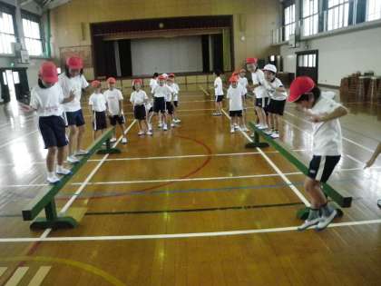 体育館の中をスキップ,ギャロップ,横っ飛びなどで駆け巡り,リズム感覚を養っています。