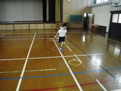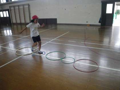 さて,フープを置いて実際に5段跳びに挑戦です。