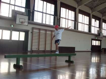 体育の授業で平均台あそびをしました。ゆっくり歩く,カニ歩きやポーズをするなど平均台あそびを楽しみました。