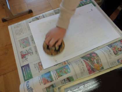 彫刻刀で版木を彫ることがとっても上手になった4年生です。いよいよ色をつけいきます。自分でローラーを回して,色をつけていくのですが,これが楽しいのです。背景になるところには,何色かの色から自分が決めた色をつけました。きれいに色がつけられました。「うわあ,きれい!」の声。その後は,いよいよ,中心人物を黒色であらわします。慎重に黒色を版木につけて,さあ,刷り上がりです。和紙を剥がしてみると,とても素敵な絵が完成。みんな,大満足の美しい版画ができあがりました。