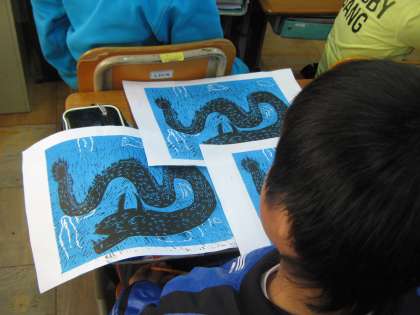 木版画に,挑戦しました。彫刻刀を使って,彫りました。