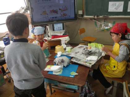 図画工作科では,「ケーキやさんになろう」という立体の授業をしています。紙粘土を使って,まずはケーキの土台の部分を作りました。新聞紙を丸めたものや,箱やパックなどを心材にして粘土を包みます。個性豊かなケーキの土台が出来上がっていきました。次はケーキの上に乗せる飾りを考えます。