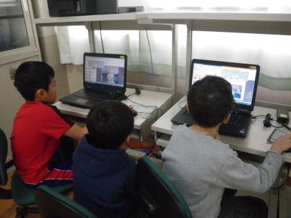 今日はICT支援員の山田先生と一緒に,コンピュータ室で勉強です。パソコンに向かい,いつものようにプレゼンのソフトを立ち上げます。立ち上げる手順をしっかりと覚えている子も多かったです。画面に出たキーボードを操作して,文を打つことも出来るようになりました。