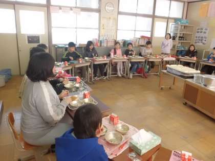 給食調理員さんにクラスに来ていただき,給食感謝タイムを持ちました。一人一人が,これまでの給食を振り返って,感じていること,苦手な食材が食べられるようになったこと,好きな給食などを発表し合いました。どの子も,毎日給食を作ってくださっていることに感謝の心をこめて発表することができました。調理員さんに質問をし,初めて知ったことに驚きを感じるなど,とても,温かく楽しい時間を持つことできました。