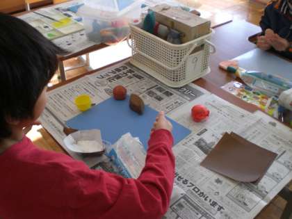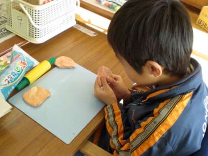 その「おかしつり」に向けて,おかしを作りました。紙粘土をのばして三角形にし,せんべいをつくったり,丸い型に紙粘土を押し入れてチョコレートを作ったり,スポンジに色紙を貼ってカステラを作ったりと,それぞれ工夫しながらお菓子作りを楽しんでいました。