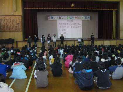 18日(月)に児童集会がありました。飼育委員会が,学校のうさぎについてクイズをしたり,活動について発表したりしました。クイズの時は,みんな一生けん命考えました。
