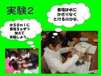 2つ目は,食塩は水にかぎりなく溶けるのかを調べる実験。