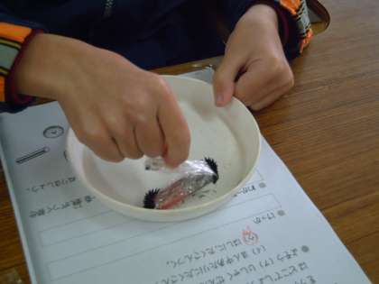 極の部分にしっかりついた砂鉄を見て、子どもたちも実験の結果がはっきり分かったようです。