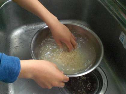 自分たちで育てたお米(コシヒカリ,もち米)を,いよいよ食べることにしました。水できれいに洗って,何回もこすりました。きれいになったら水を入れて,炊飯器にセットしました。自分たちで精米しましたが,玄米に近いような色をしていました。給食時間の前にスイッチを押し,5時間目にコシヒカリはおにぎりに,もち米はすり鉢でついておもちにして食べました。ちょっと水分が多かったのですが,子どもたちは「おいしい!」と言って,おにぎりやおもちを食べていました。子どもたちは自分たちが田植え,稲刈り,脱穀,もみすり、精米と手をかけてきたお米を,大事そうに食べていました。お米を食べられるようにするまでには大変な手間がかかる,ということを実感していました。