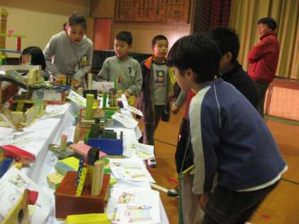 作品展には,紙版画「広がれ生き物ワールド」と木工「切って切ってトントントン」を出展しました。図工の時間に,アイデアを出しながら作った,元気いっぱいの作品が並び,子ども達も満足そうでした。