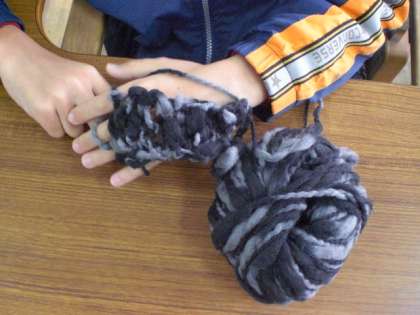 指編みでマフラーを編んでいます。もうすぐ卒業する6年生へのプレゼントにするために,毎日こつこつと指編みをしています。最初はぎこちなかったのですが,だんだん慣れてきて編むスピードも速くなってきました。一人につき3本編んで,三つ編みにしてマフラーに仕上げる予定です。今度の3校交流会でプレゼントを渡すので,それまでにできるようにがんばっているところです。