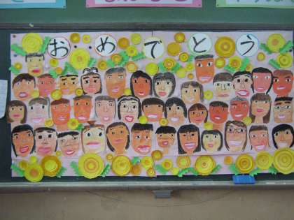『6年生を送る会』に掲示する作品が,出来上がりました。みんなで自画像を描き,飾り付けました。