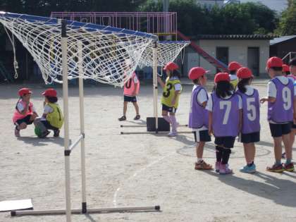 準備・後片付けに今は,一生懸命な1年生です。得点を摂るためには,どうすればいいのかチームで考え合う時間も作り,いろんな意見をチームのために出し合っています。